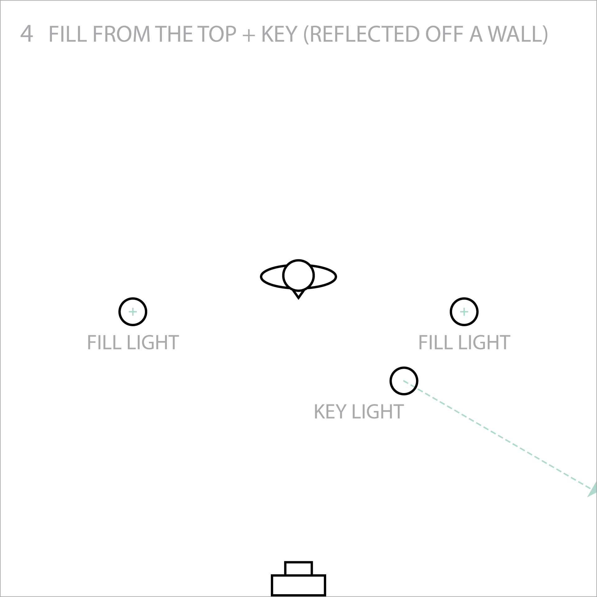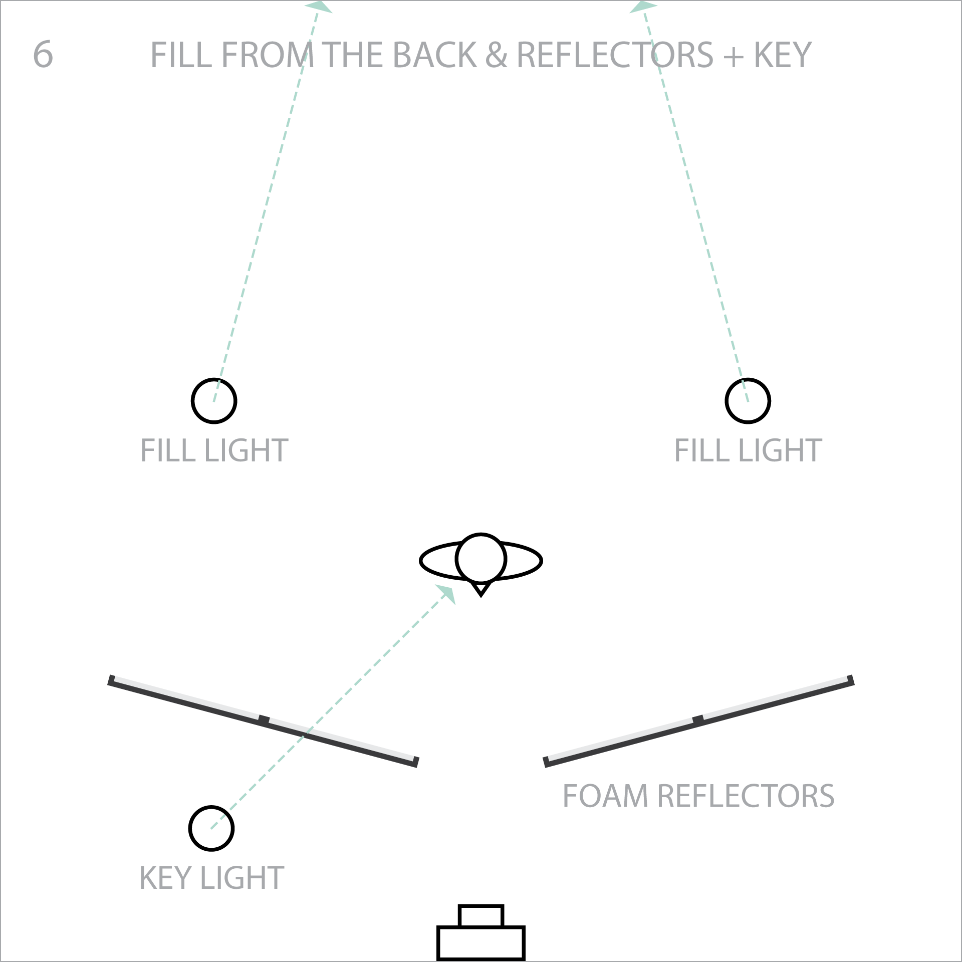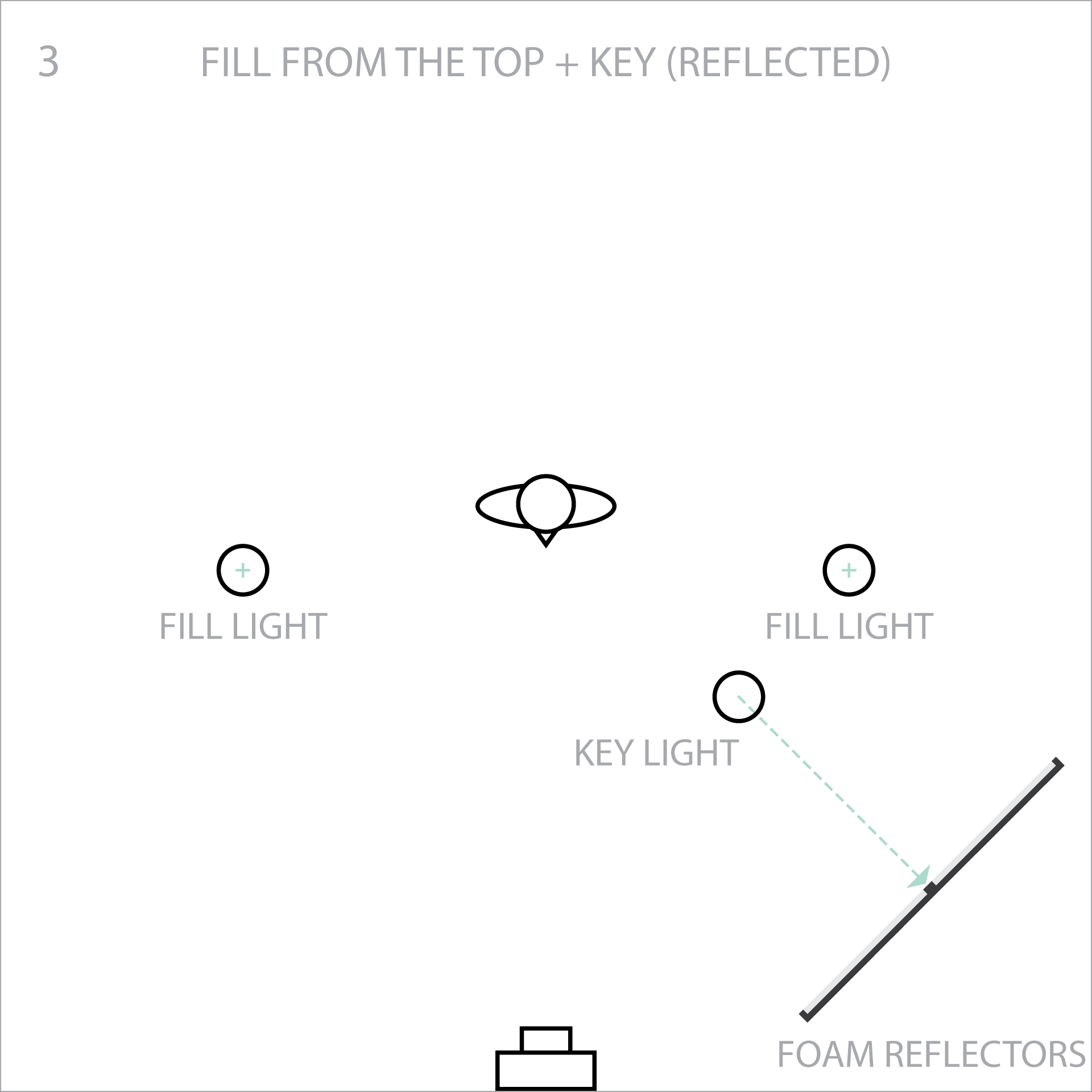 На рисунке 3 показана базовая схема заполнения от потолка с добавлением мягкого рисующего света, полученного отражением от двух пенопластовых отражателей.